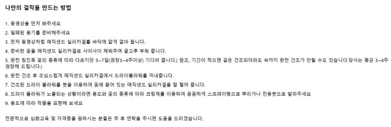 오프레리의 하바리움 용액은 변색의 예방이 되고 오래 보관시에도 아름다움을 유지할 수 있다고 하길래 일반 용액을 파는 곳보다는 나을 것 같아서 구매하게 되었어요 😘😘
